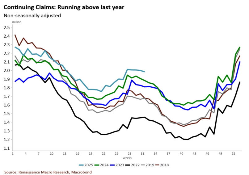 Initial jobless claims declined by 3k to 224k in the week ending August 9, however the "slow bleed" in the jobs market persists. While continuing claims did decline this week, the level remains substantially elevated compared to the same period last year, representing approximately 5% growth YoY.