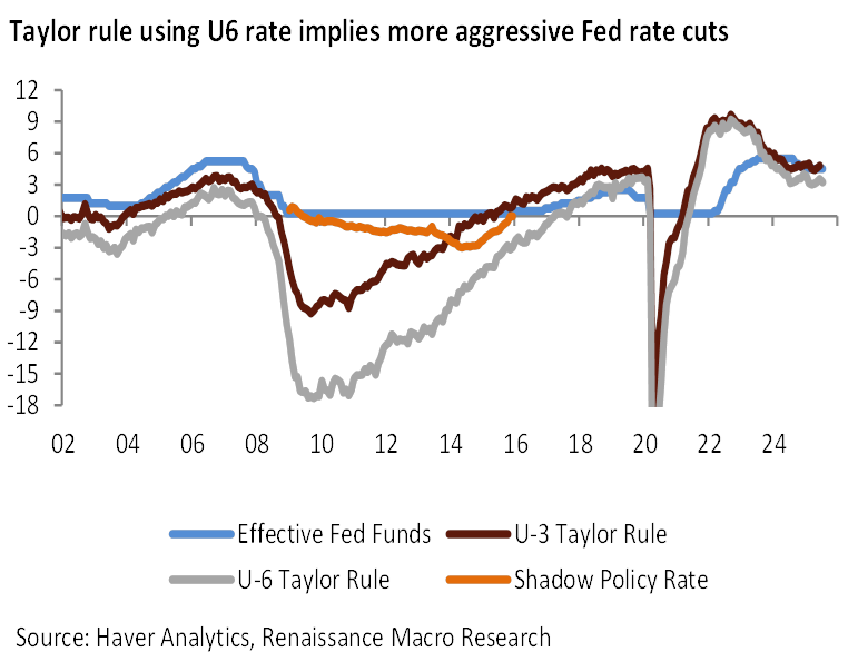 Leaning on the U3 unemployment rate and thus characterizing labor markets as "solid" is doing a lot of work for the monetary policy hawks. Neil estimates a Taylor Rule which implies lowering the funds rate by 1.3% if inflation falls by 1% and by almost 2% if underemployment rate (gap between U6 rate and that of 2019) rises by 1%. Neil admits maybe he was too pessimistic, but even assuming a neutral rate of 1.5%, we're 75bps too restrictive.