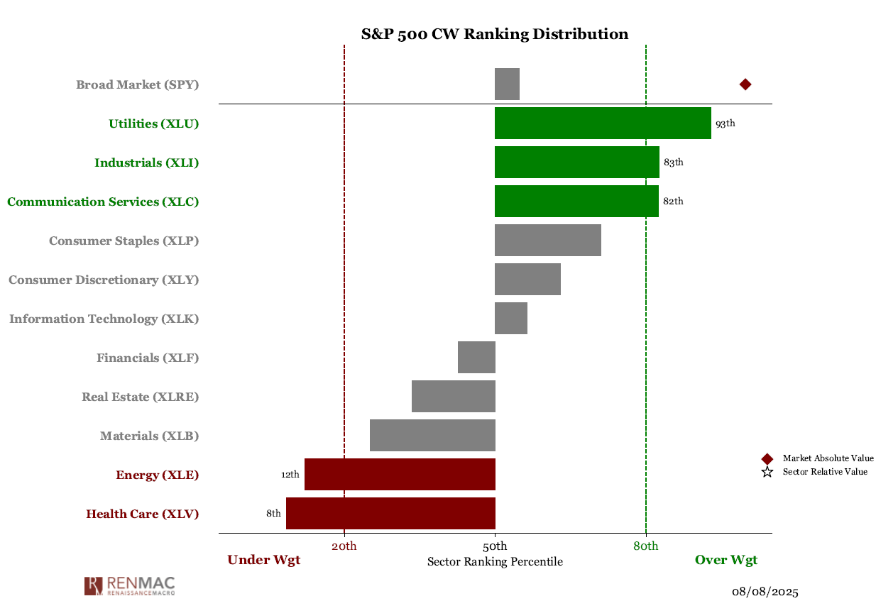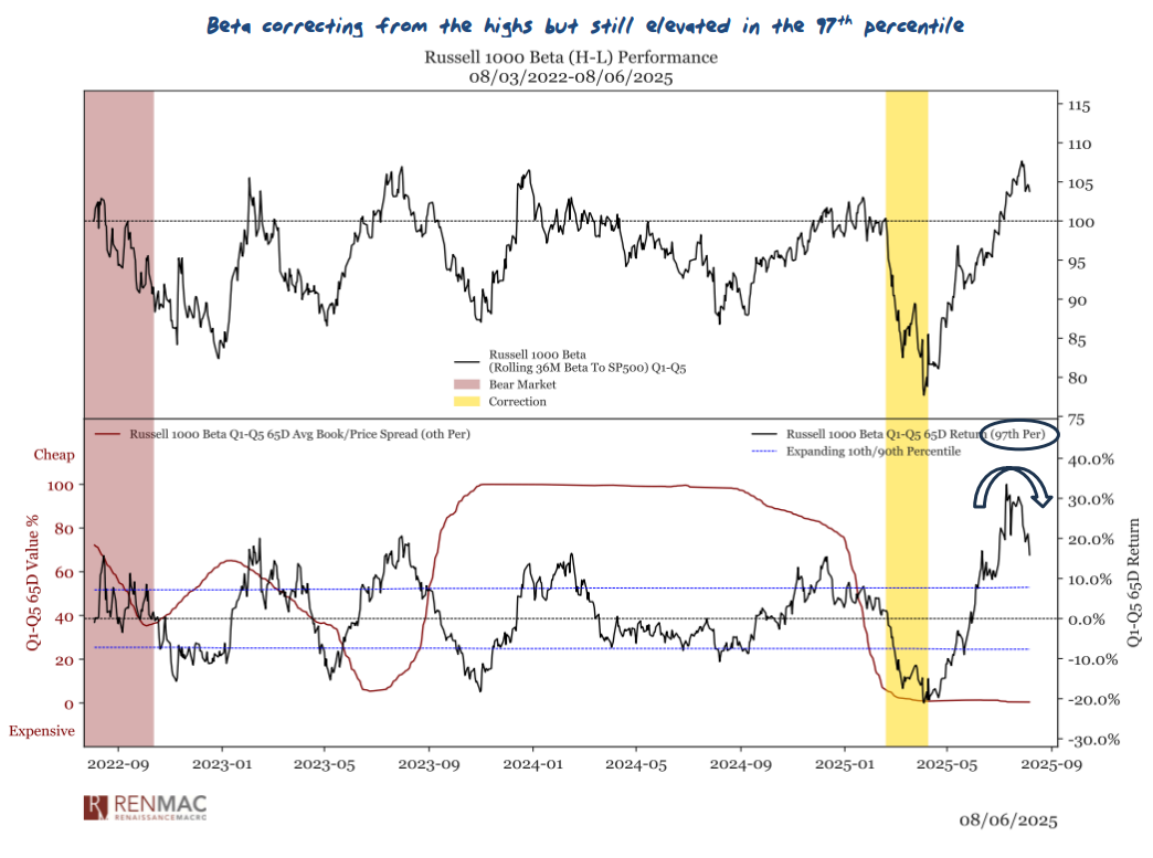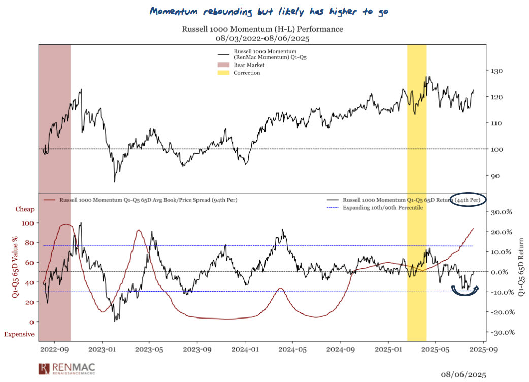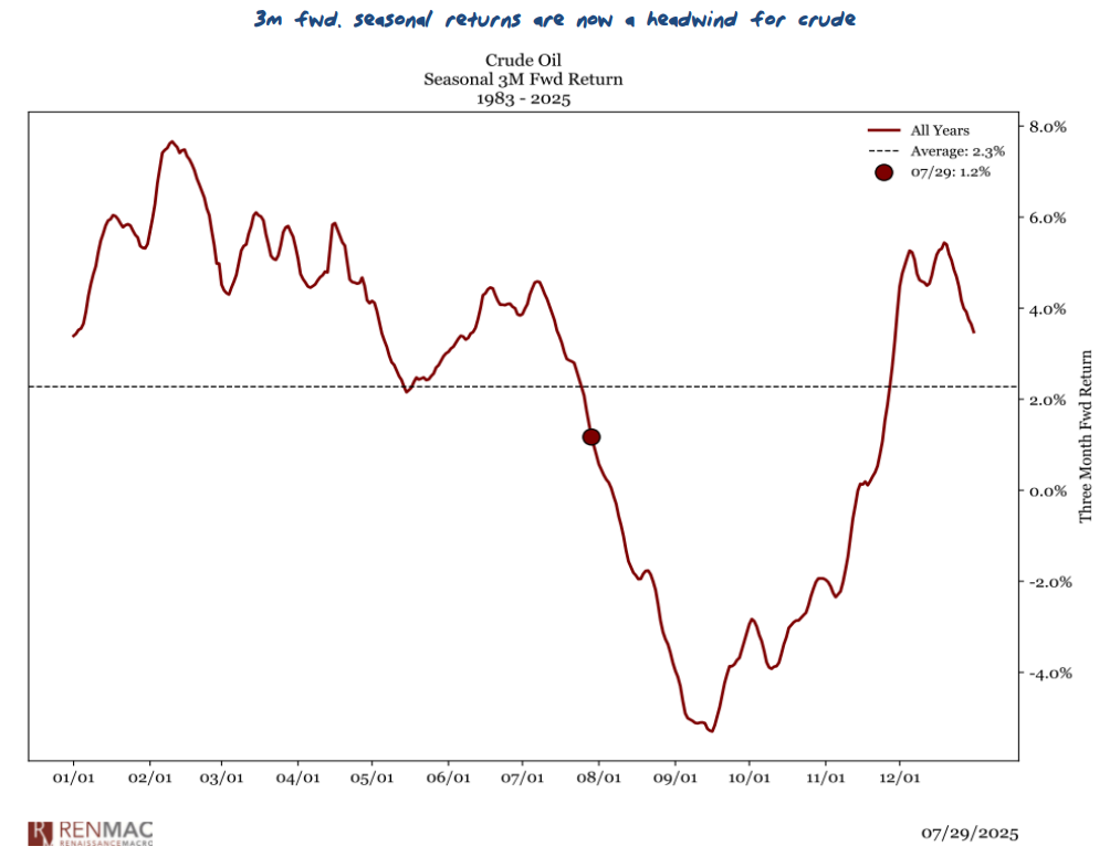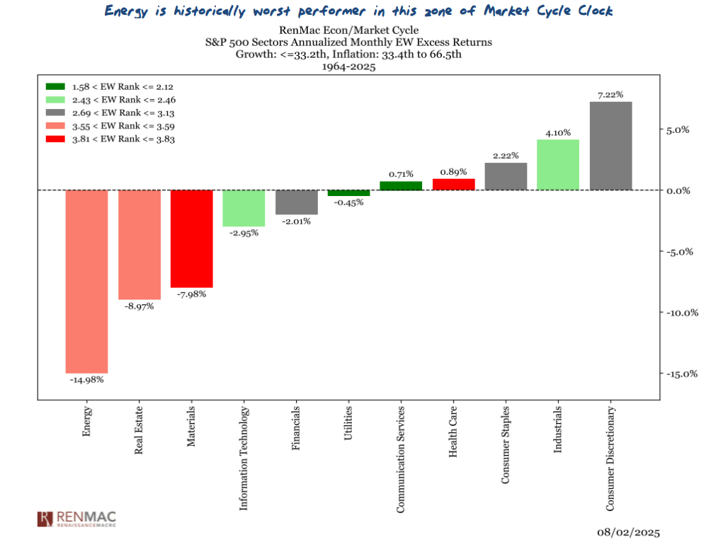 Our market cycle clock saw some marginal improvement in our inflation algo for July. It suggests SPX returns that are typically softer than average, though still positive. This is consistent with weaker seasonal tendencies, especially as we get into September, but it also moves us closer to the zone that historically finds the most aggressive easing cycles from the Fed (bottom left). See here for a video of Jeff deGraaf going over the latest update.