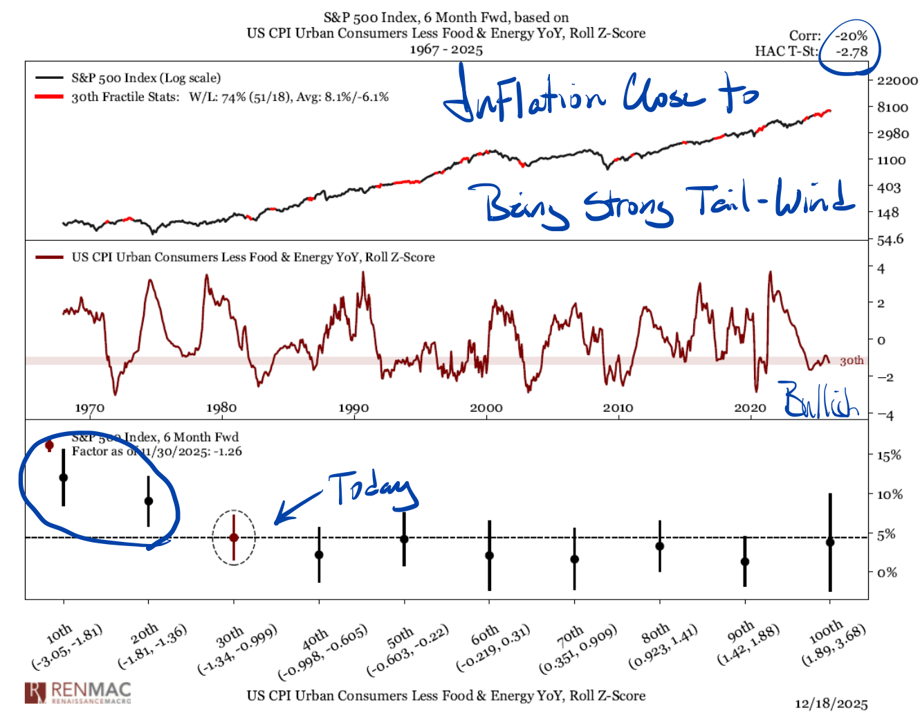• Since 1967, Core-CPI has a strong negative relationship with 6-month forward returns, so Thursday's SPX strength was no surprise given the better than expected CPI.