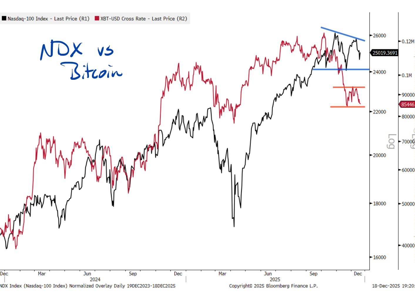 • NDX momentum is soft but holding up better than Bitcoin. The key question is whether crypto weakness spills into equities or equity strength stabilizes crypto.