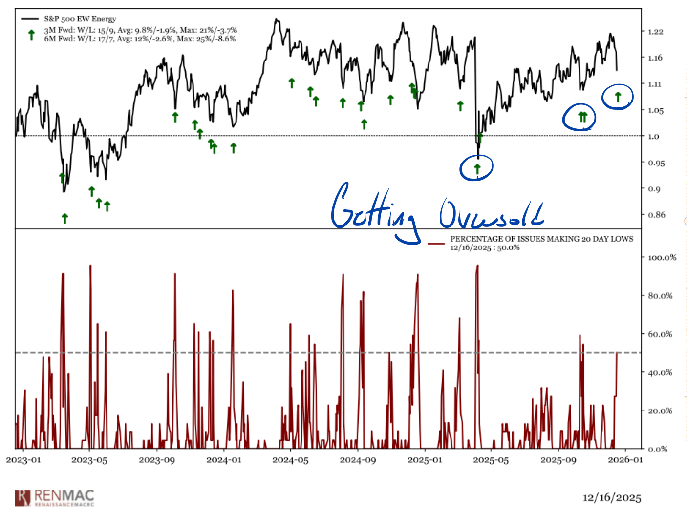 • The % of energy names making 20-day lows spiked to a threshold of 50%. In April, that was 100% and in October the number reached 60% before energy names were able to set a tactical low.