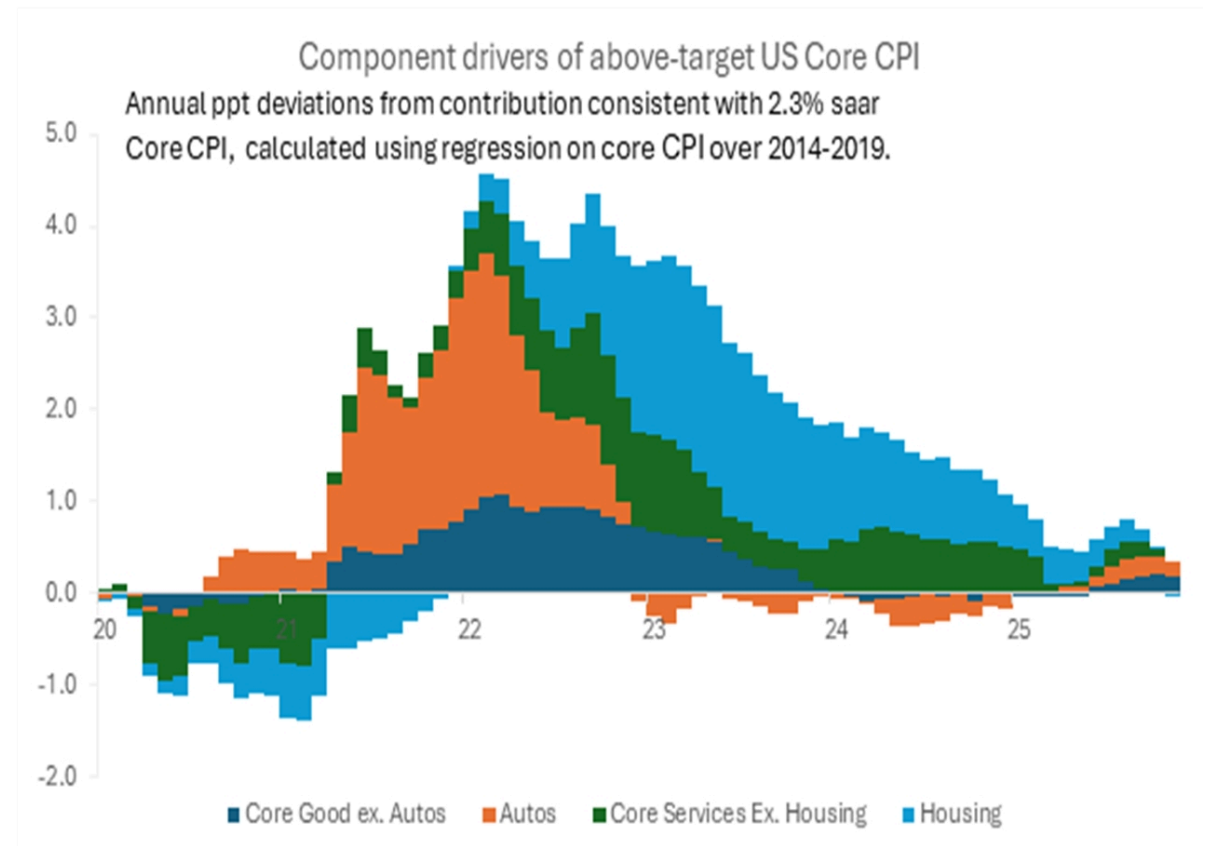 • Excess core CPI inflation has largely unwound. On a YoY basis, virtually all remaining excess now stems from goods while housing and core services excl. housing have dwindled to zero or turned slightly negative. The inflation overshoot is essentially behind us.