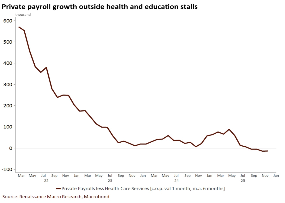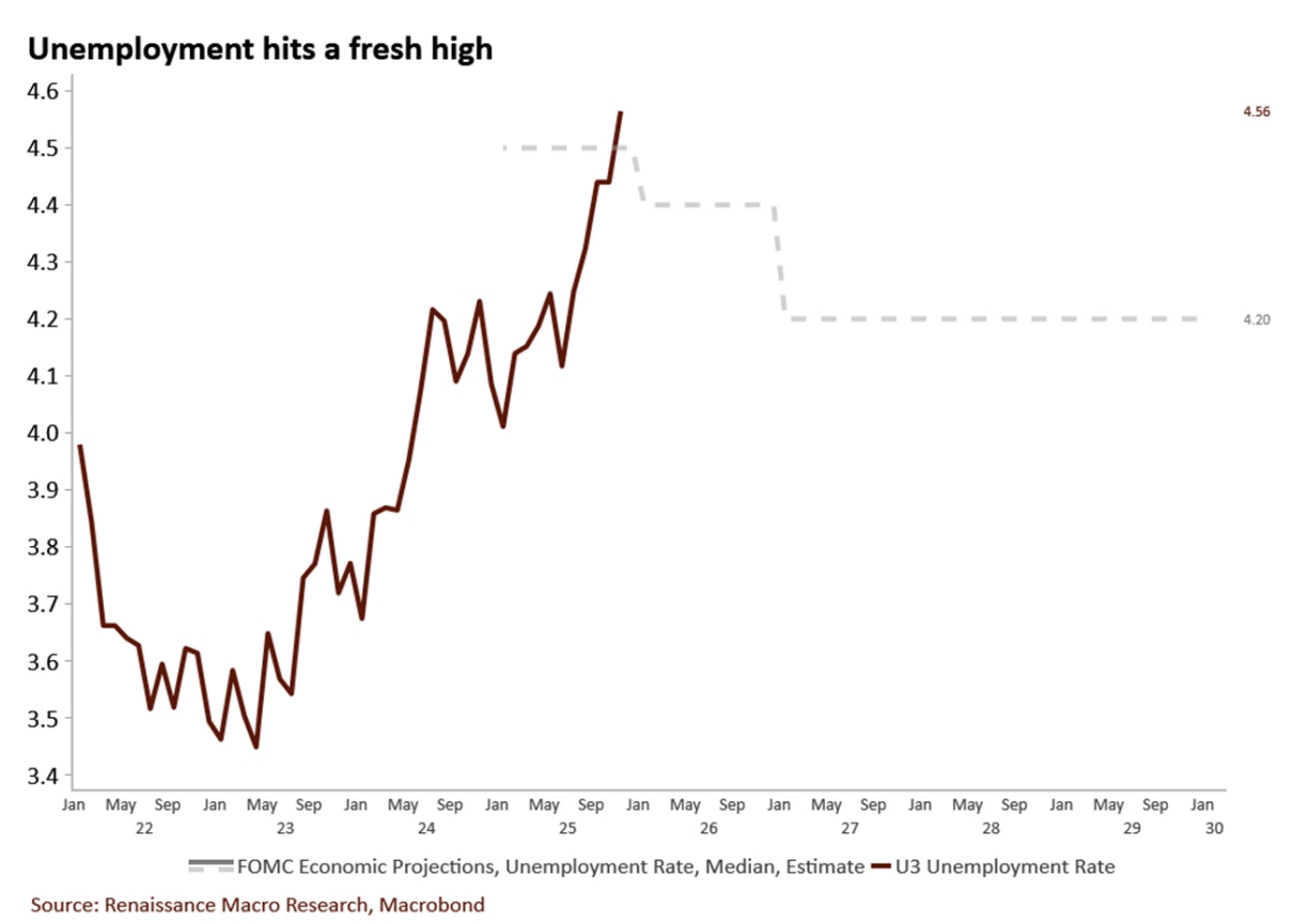 • Unemployment rate jumped to 4.56% in November, bringing us past the Fed expectations for EOY 2026 - though important to note the BLS cautioned that estimates this month "will have slightly higher variance than usual".