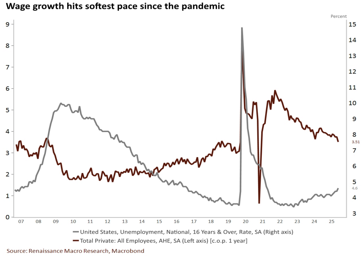 • The rise in unemployment is having predictable consequences on wage growth as average hourly earnings have climbed 3.5% over the last year, the softest since the pandemic.