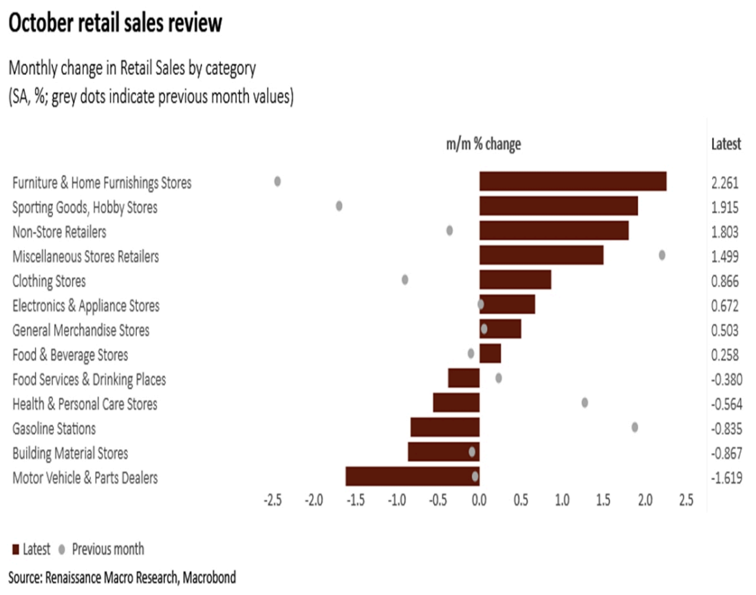 • Retail sales showed a sharp rebound in control sales following a September decline.