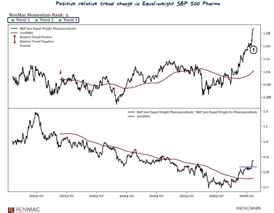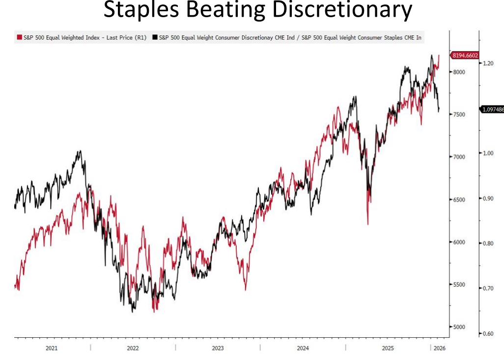 • Staples pulled back at resistance levels, maintaining relative downtrend. Sharp unwind in beta and extreme underperformance suggests continued downward pressure.