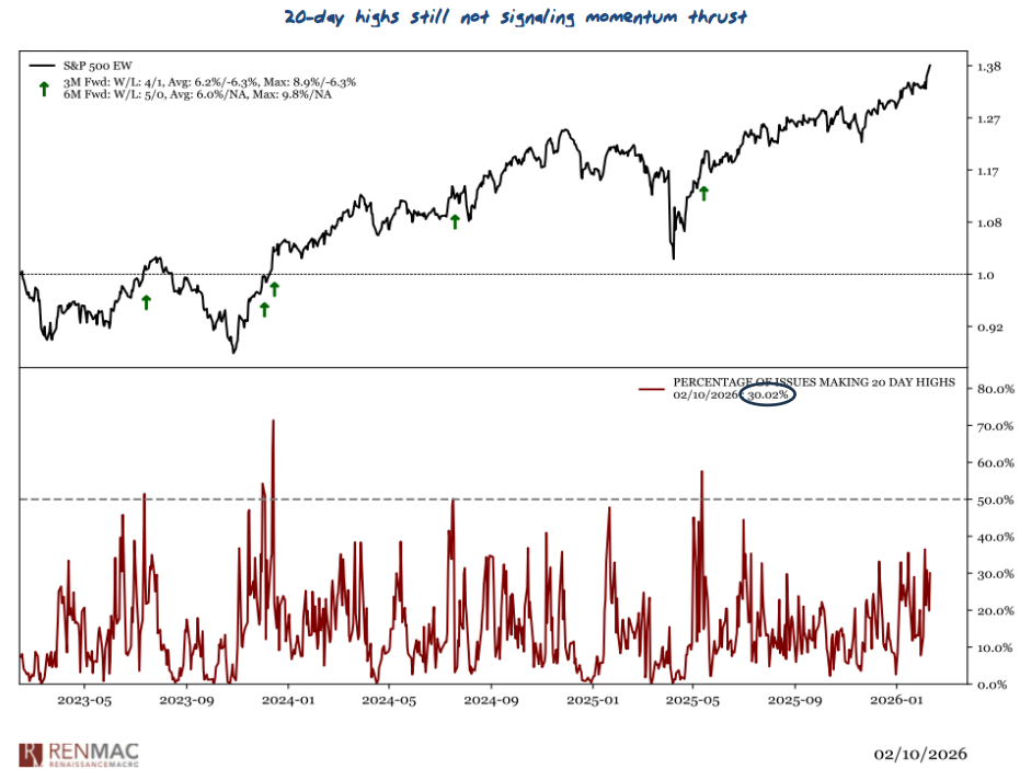 • Bullish signals may re-emerge if a high percentage of stocks move about their 20dma and hit 20-day highs, suggesting a reassertion of the bull trend.