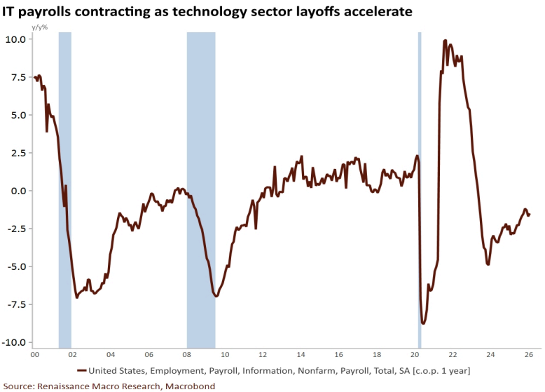 • Technology: Layoff announcements have been perking up in recent months and share prices of software firms have been sliding.