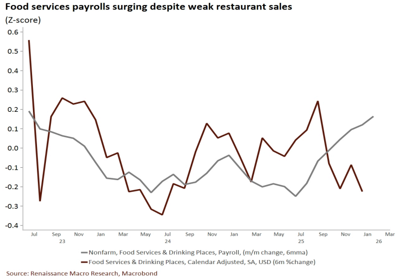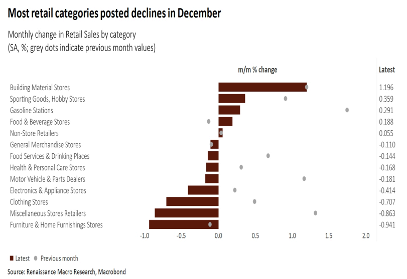 • The combination of a weaker print and downward revisions implies retail spending carried less momentum into year-end than initially thought. That said, consumer spending remained resilient throughout Q4 on the whole, likely advancing ~3.0% annualized.