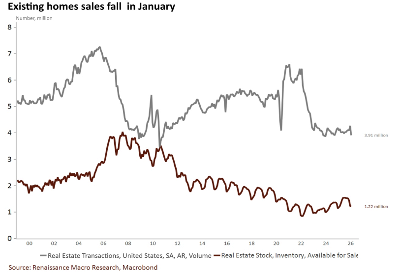 • Existing home sales dropped 8.4% MoM to 3.91 million units SAAR in January, well below the consensus estimate of 4.15 million and the largest decline since February 2022.