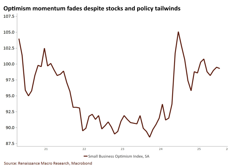 • Despite the weaker intentions, small firms remain upbeat on the outlook with 15% reporting that now is a good time to expand. Now, despite rising stock prices and the passage of OB3, small business sentiment is actually lower than it was this past summer.
