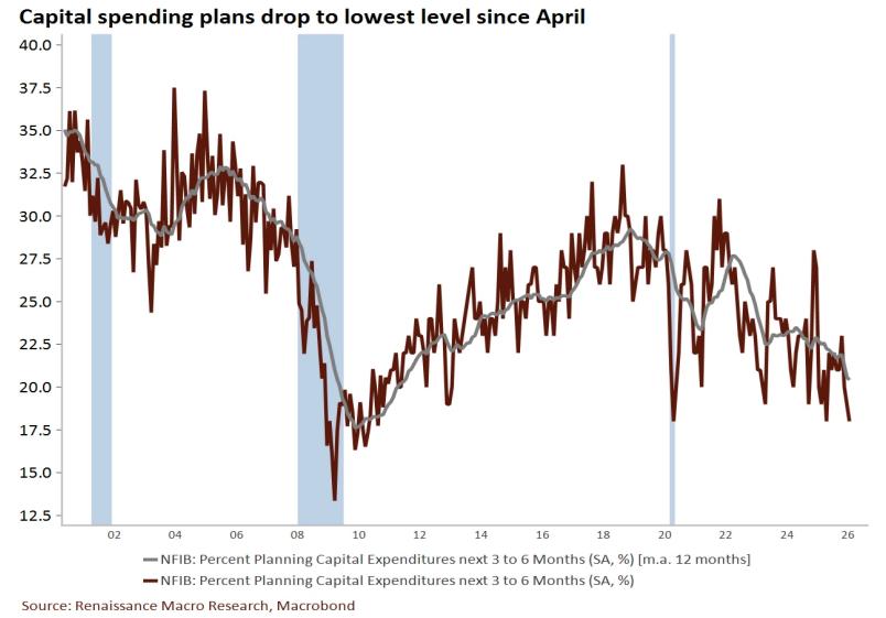 • In January, NFIB Small Business Optimism Index fell to 99.3, roughly where it was in October. Despite talks of a capital spending boom, plans to make capital outlays over the next 3-6 months fell to 18, the lowest reading since April. Employment expectations also eased up to a 3-month low of 16.
