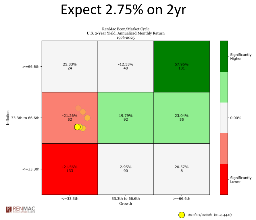 • The 2-year Treasury yield is in a confirmed downtrend and sitting near support, fully consistent with the market cycle clock.