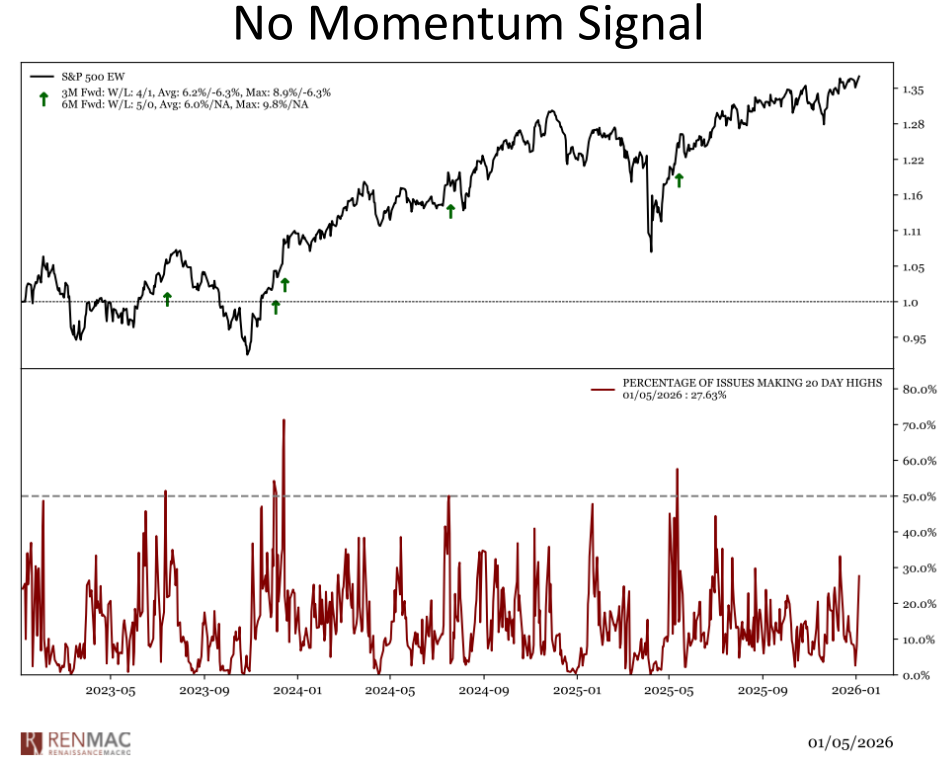 • Bullish signals may re-emerge if a high percentage of stocks move about their 20dma and hit 20-day highs, suggesting a reassertion of the bull trend.