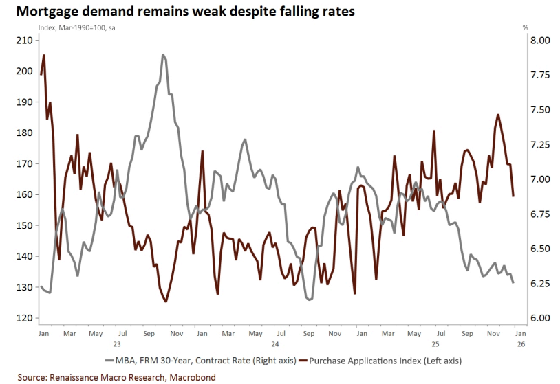 • The broader story here is that even as the 30Y fixed rate mortgage has declined to a fresh low of 6.25%, purchase loan demand hasn't taken off.