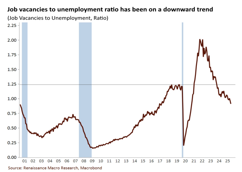 • Job openings rate slid to 4.3%. The ratio of openings to unemployed slid to 0.913 in November, a fresh low.