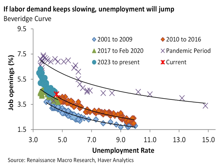 • The risk today is that the labor market is operating along a point in the Beveridge Curve where declines in excess labor demand (openings) will coincide with outsized increases in unemployment.