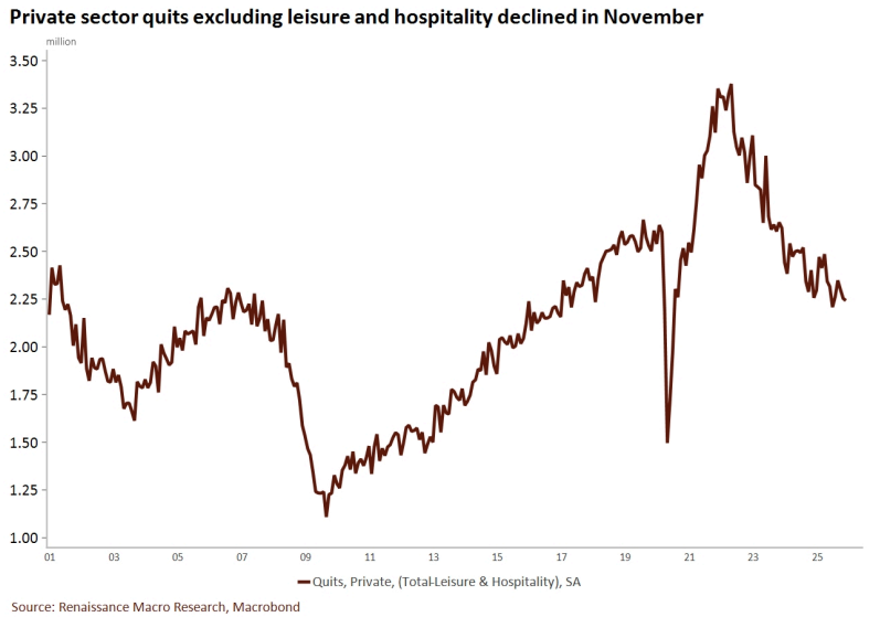 • November's JOLTS figures did not change much on the tone of the labor market. Conditions remain sluggish and continue to cool but not collapse. A few details worth highlighting: