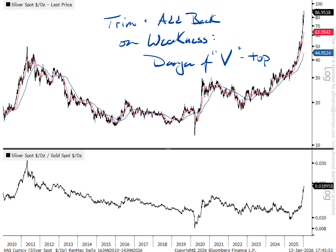 • Silver is parabolic and prone to “V-tops”. Trends are good if you own it, but they are unsustainable.