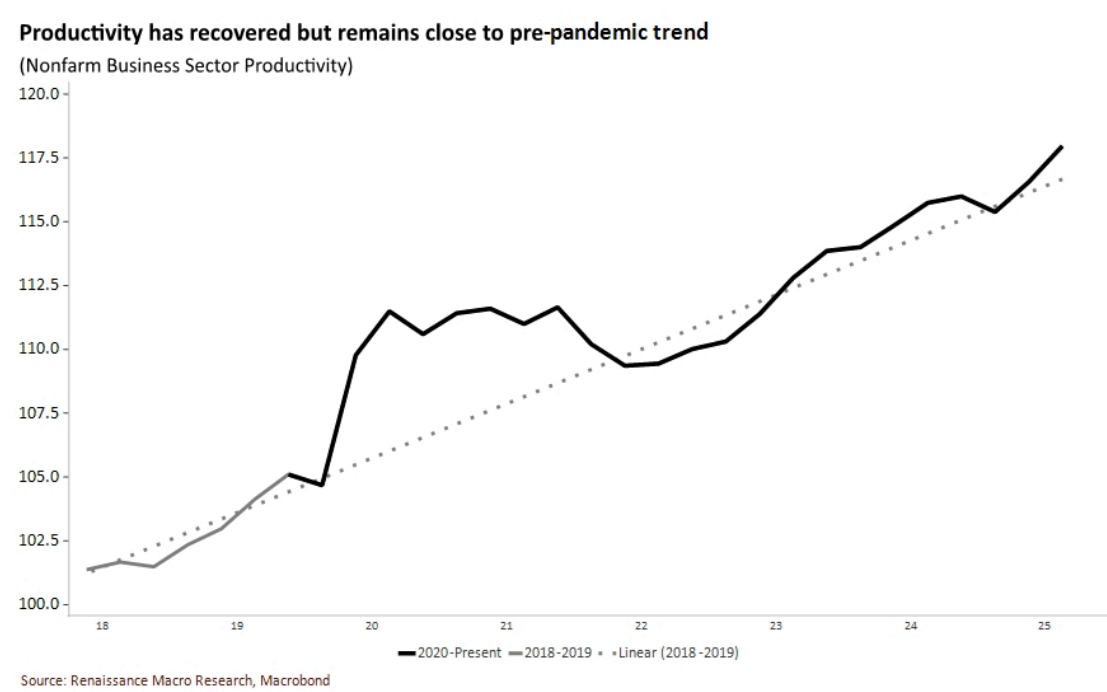 • Productivity has ebbed and flowed since the pandemic. There was a strong boom early, followed by a decline. It has now been recovering since 2023, but remains in-line (or modestly above) the pre-pandemic trend.