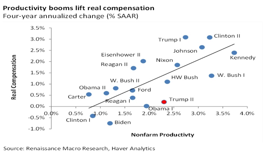 • In a genuine boom, real compensation growth should be expanding. Typically, with better labor productivity comes an increase in real compensation, but the current administration is well below trendline.