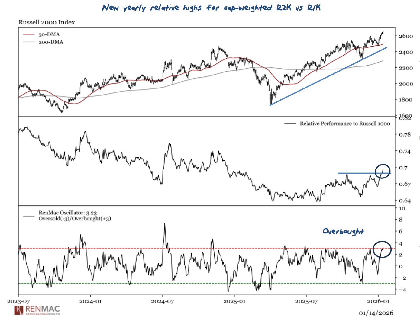 • The Russell 2000 continues to impress as it’s now up roughly 7% to start the year and is breaking out to new 52-week relative highs vs the Russell 1000 on a cap-weighted basis.