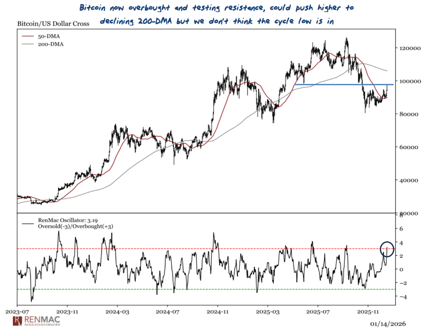• Bitcoin is now overbought and challenging the first level of resistance around $98k. The bounce could push higher to the declining 200-DMA but we wouldn’t get greedy as we don’t think the cycle lows are in. If playing for the bounce, we would keep stops tight.