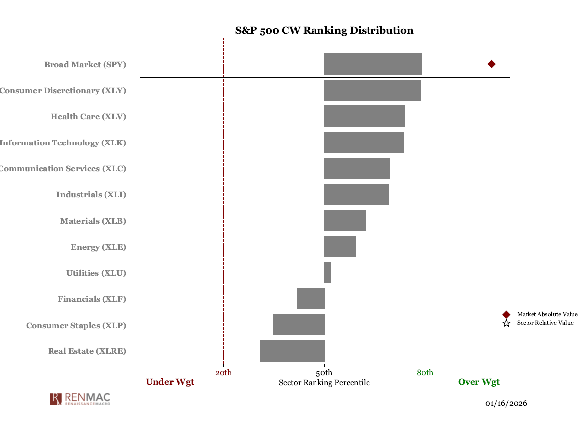 • Staples pulled back at resistance levels, maintaining relative downtrend. Sharp unwind in beta and extreme underperformance suggests continued downward pressure.