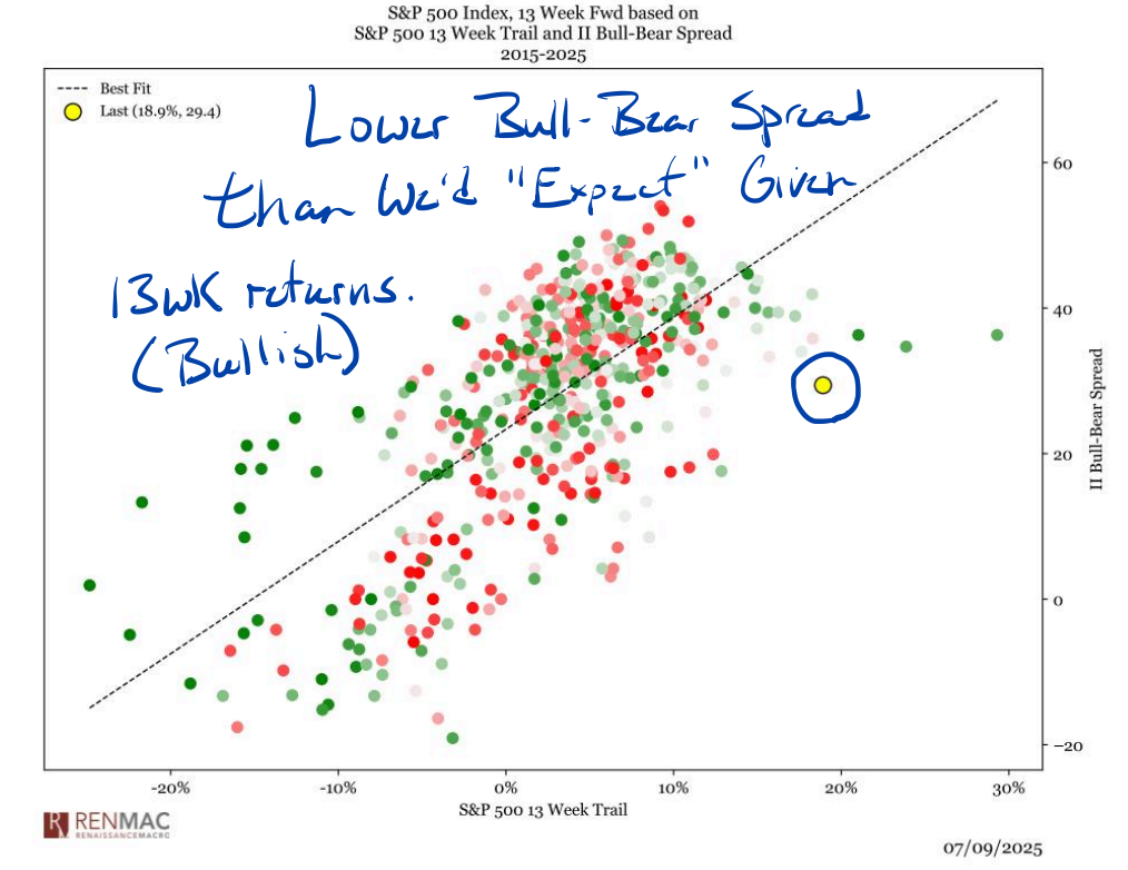 Screenshot 2025-03-27 095259 Sector Ranks Screenshot 2025-03-27 095259 Screenshot 2025-07-11 103100 Screenshot 2025-03-27 095259 Chart of the weekScreenshot 2025-03-27 095259SPX returns predict sentiment, but knowing that relationship, we can tease out how bullish investors are versus those returns. Today, bulls are LOWER than we'd expect given SPX, that tends to be bullish.Screenshot 2025-03-27 095259Screenshot 2025-07-11 093943