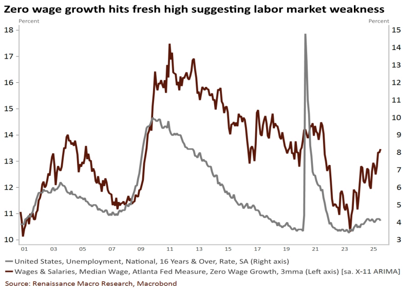 • More workers are now seeing no change in wages year-over-year - a sign of nominal wage rigidity as companies opt to freeze pay rather than cut.