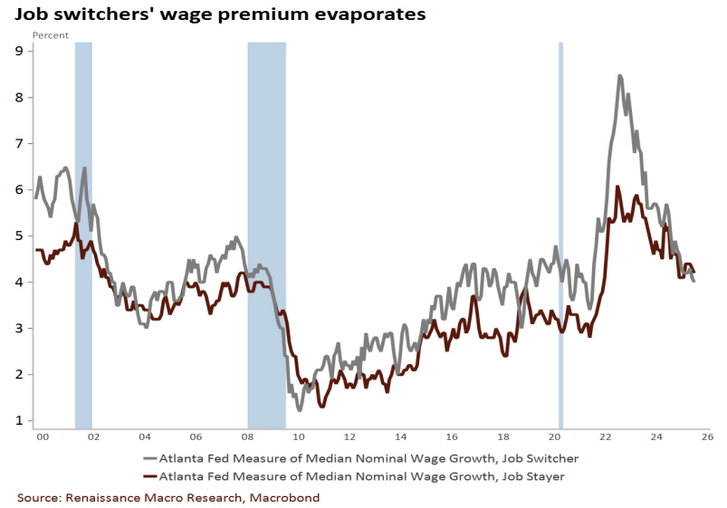 • And the wage premium for job-switchers has disappeared. With switchers now earning less (4.0%) than stayers (4.2%), the incentive to quit is fading fast.