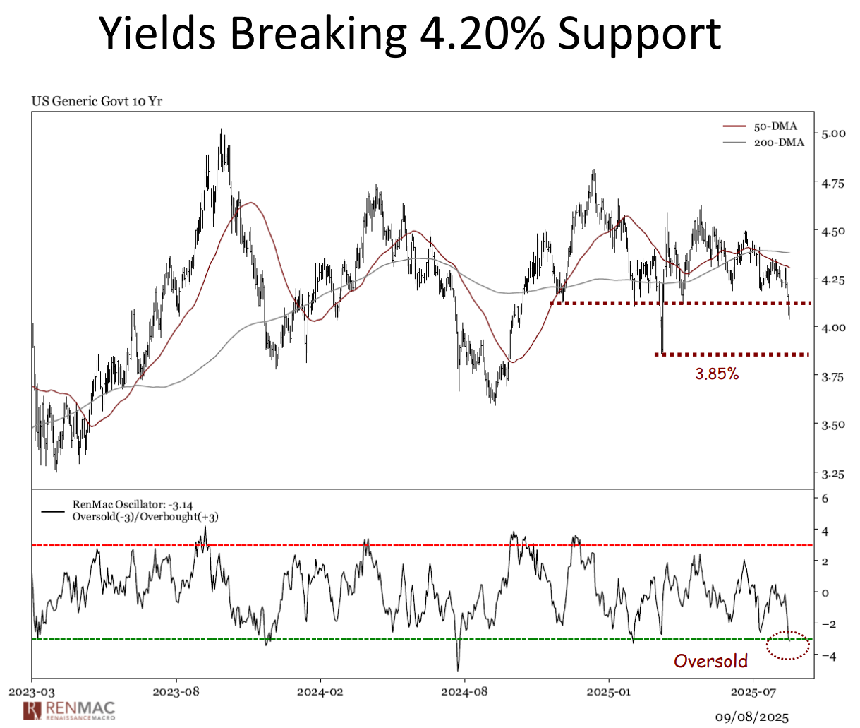 • The 10-year broke key support at 4.20%. While yields are a bit oversold, any bounce would like cap near the 50-day.
