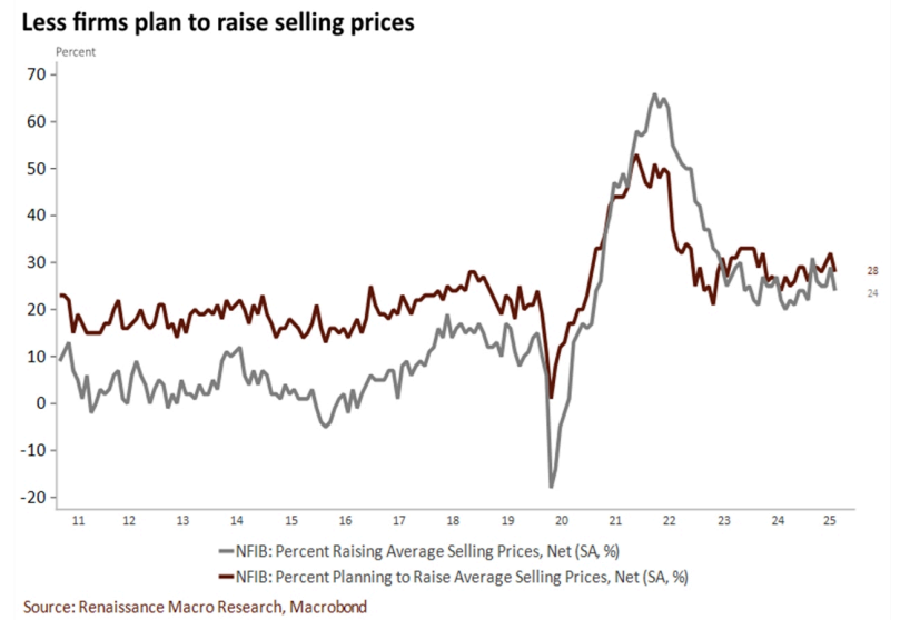 • Notably, plans to increase employment rose to 15, the best since February, and firms with positions not able to fill right now also slid to a fresh low of 32, a sign of cooling labor demand.