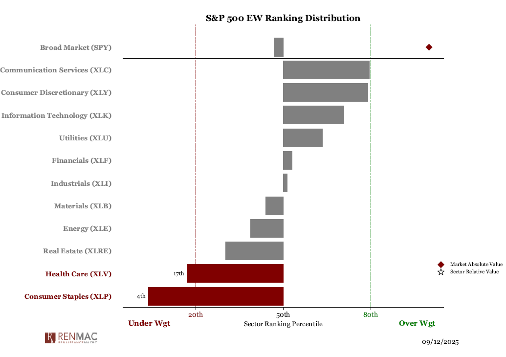 • Staples pulled back at resistance levels, maintaining relative downtrend. Sharp unwind in beta and extreme underperformance suggests continued downward pressure.